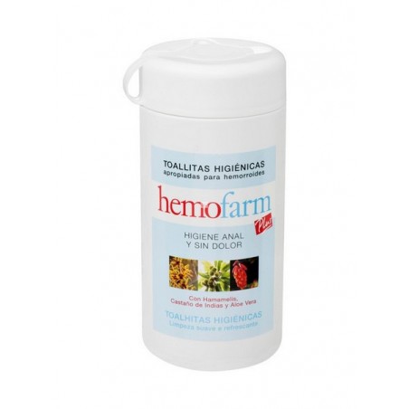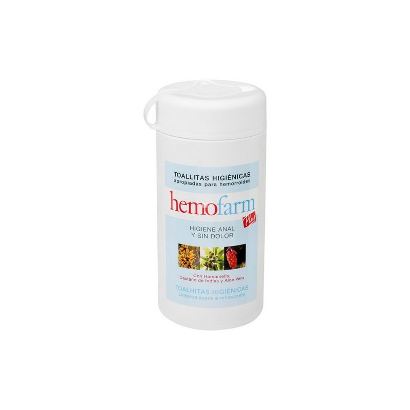 HEMOFARM PLUS TOALLITAS BOTE 60 UDS Hemofarm Plus son toallitas húmedas destinadas a la higiene y cuidado de la zona anal cuando esta presenta fisuras o hemorroides. INDICACIONES - Bote de 60 toallitas húmedas. - Hamamelis, castaño de Indias, aloe vera y cloruro de benzalconio. - Limpian sin irritar y proporcionan la calma y el frescor necesarios. UTILIZACIÓN Utilizar después de cada deposición las toallitas que sean necesarias.