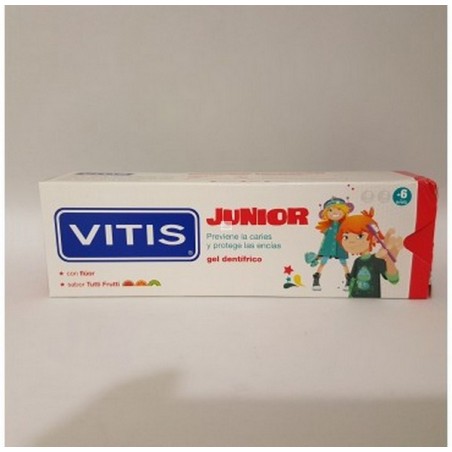 Vitis Gel Dentrifico:Protege contra la caries, remineraliza los dientes, cuida las encias, baja abrasividad, no pica, a partir de 3 años. Como se usa: Vitis Gel Dentrifico en niños de 6 años o menores utilizar una cantidad del tamaño de 1 guisante bajo la supervision de un adulto para minimizar e riesgo de ingestion, en caso de recibir un aporte suplementerio de fluor atraves de otras fuentes, consulte a su odontólogo o a su medico dee cabecera.